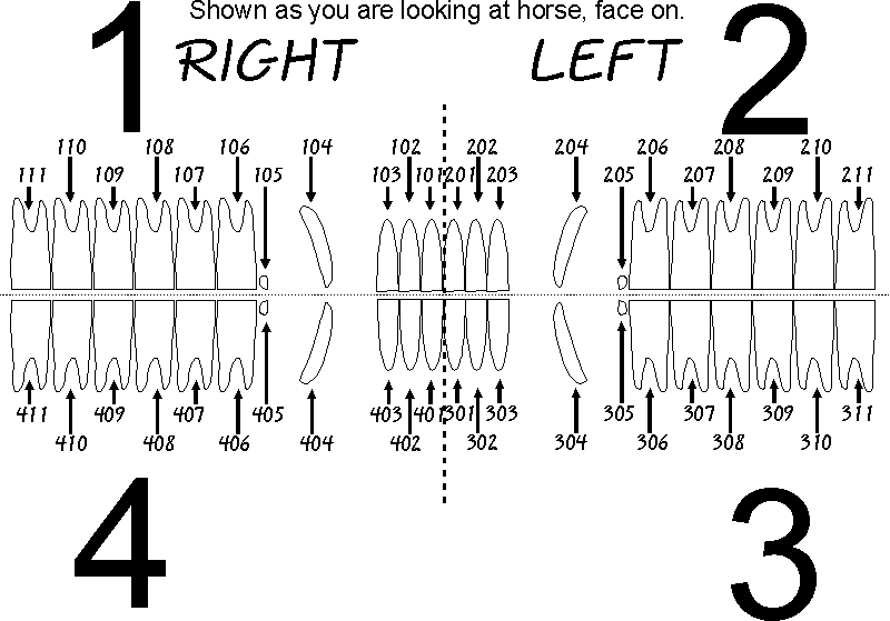 Na idade adulta, um cavalo tem 40 dentes e a égua 36. São 12 Incisivos, 4 caninos e 24 molares. Os potros tem apenas 24 dentes. a dentição de leite vai até os 2 anos e meio. É só após o quinto ano, que com a dentição completa, o cavalo é considerado um animal adulto.